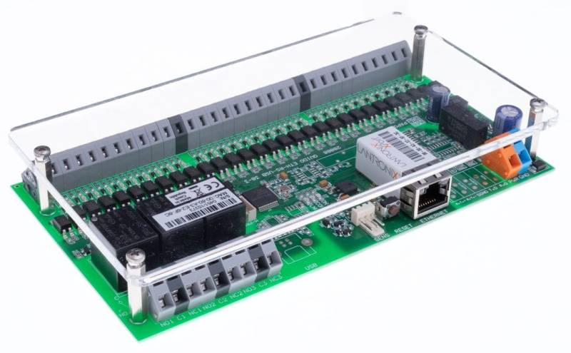 Plexi cover for the Quido I/O module. Necessary posts and screws are included for mounting the cover to an electronics board. (The picture is for illustration only, the electronics board is not included.)