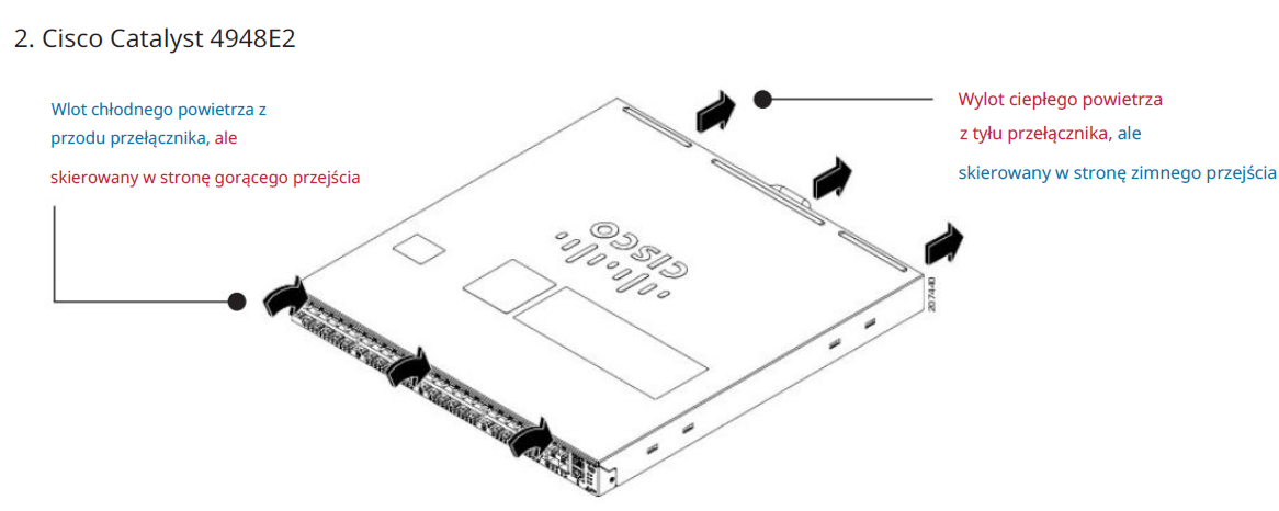 - Opierając się na schemacie wydechu, ten przełącznik ma wloty powietrza chłodzącego po bokach lub z przodu (z rzeczywistymi portami). Te lokalizacje znajdują się najbliżej gorącego przejścia. Zatem przepływ powietrza chłodzącego dla przełącznika jest powietrzem wywiewanym ze wszystkich innych urządzeń.