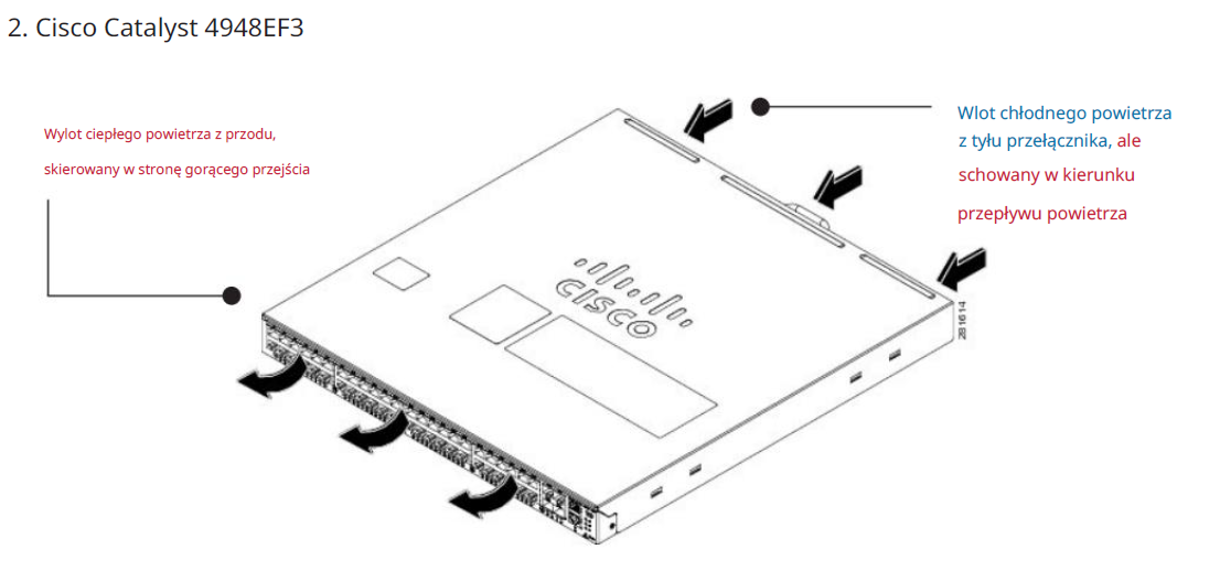 Szczególna klasa sprzętu — przełączniki sieciowe — od wielu lat kwestionuje konwencje dotyczące przepływu powietrza. Schematy przepływu powietrza w przełączniku sieciowym mogą się znacznie różnić w zależności od producenta, modelu i konfiguracji. Rozważmy poniższe obrazy dostarczone przez Cisco — jednego z czołowych dostawców sprzętu sieciowego, przedstawiające szczegółowo możliwości układu Catalyst 4948. Na tych przykładach widzimy trzy ścieżki przepływu powietrza dla tej samej rodziny produktów: