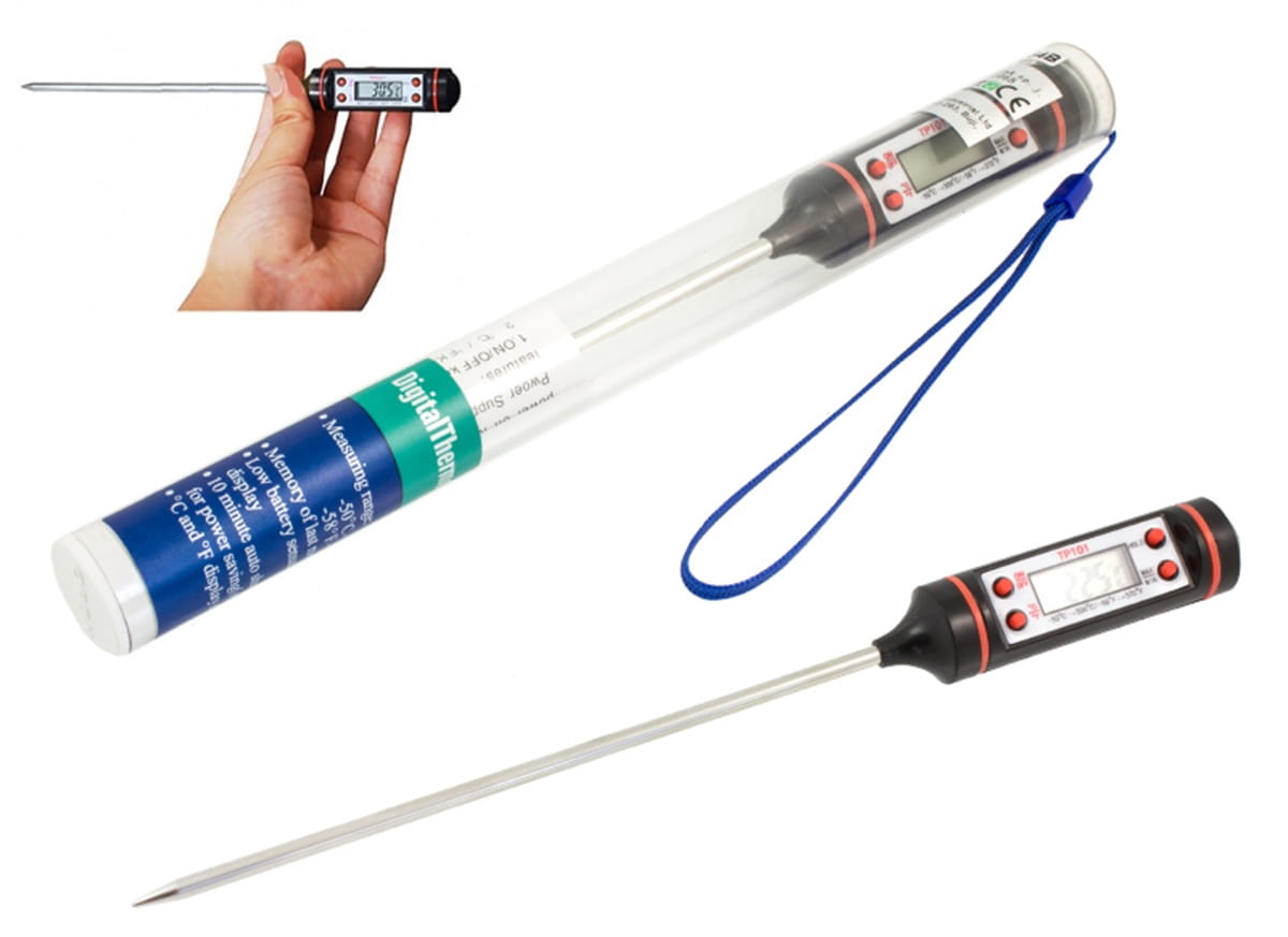 - Wyposażony w długą igłę ze stali nierdzewnej zakończoną czujnikiem temperatury.