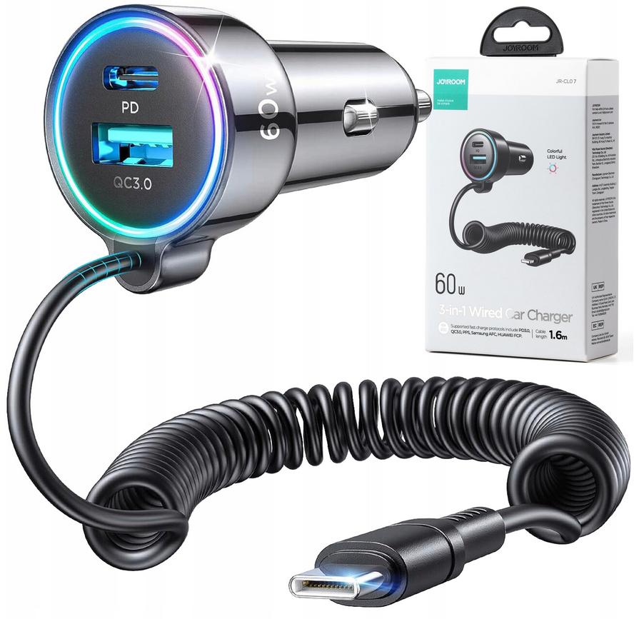 Ładowarka samochodowa 3w1 Joyroom JR-CL07 60W 4.0A PD 3.0 QC 3.0 1x USB-A 1x USB-C z kablem 1.6M