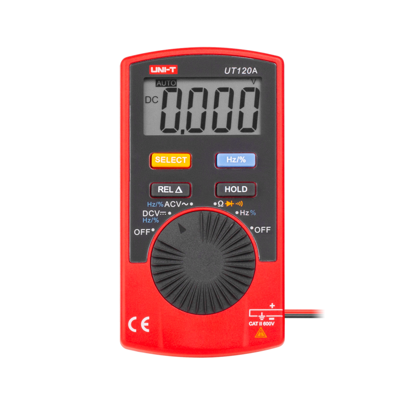 UT120A jest wyjątkowo kompaktowy, z wymiarami 110 x 58,2 x 10,8 mm i wagą zaledwie 76 g, co sprawia, że jest łatwy do przenoszenia i wygodny w użyciu. Wyświetlacz o rozmiarze 43 x 22 mm zapewnia czytelność odczytów, a zasilanie z baterii 3 V (CR2032) gwarantuje długą pracę bez potrzeby częstej wymiany źródła zasilania. W zestawie z miernikiem znajdują się niezbędne akcesoria, takie jak bateria oraz etui, co umożliwia bezpieczne przechowywanie i transport urządzenia.