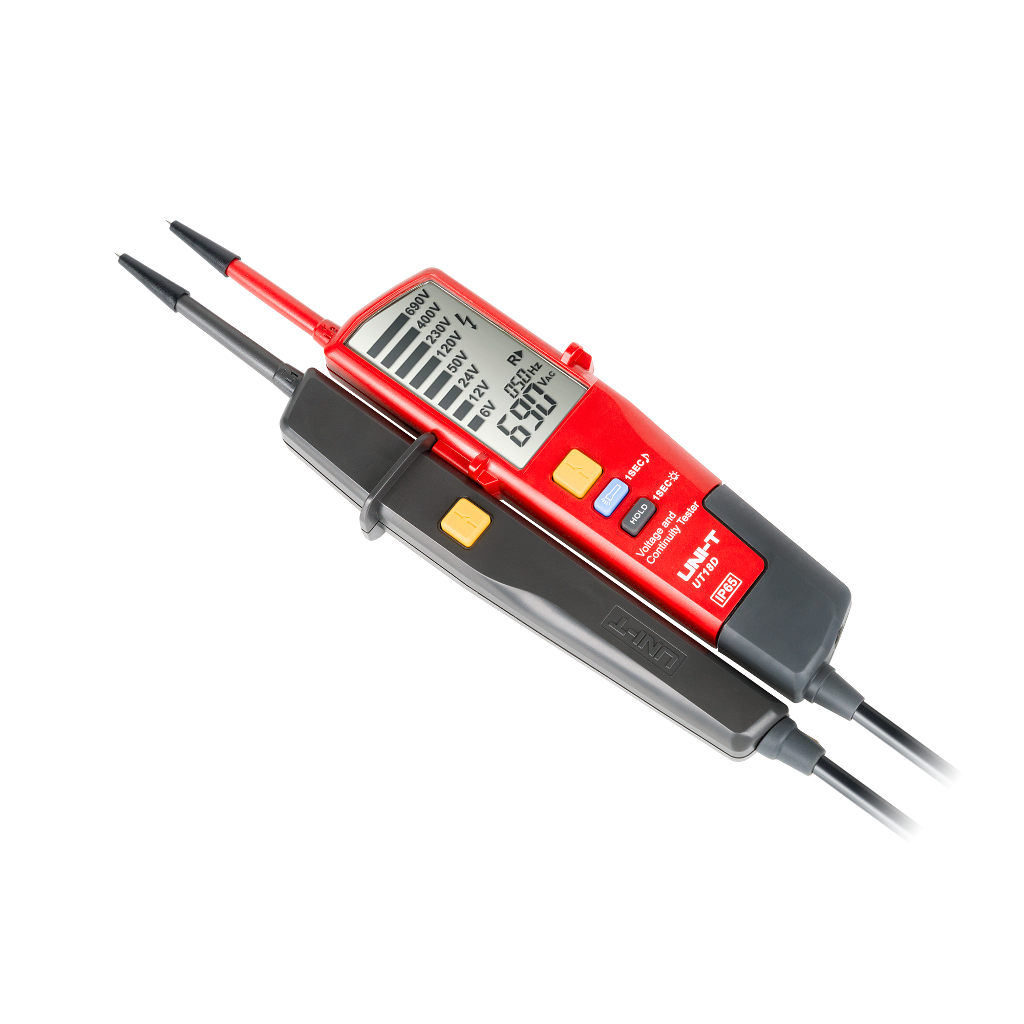 UT18D oferuje szeroki zakres pomiarowy napięcia od 6 V do 690 V z dokładnością ?(1,5%+5). Umożliwia także testowanie ciągłości obwodu do 100 k? oraz detekcję polaryzacji, co zapewnia dokładną analizę stanu elektrycznego. Funkcja testowania RCD oraz automatyczna zmiana zakresów pomiarowych zwiększa jego uniwersalność.