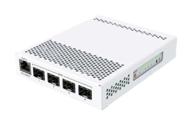 CRS305 to kompaktowy, lecz bardzo wydajny przełącznik z czterema portami SFP+ (do 10 gigabitów na port). Urządzenie wyposażono w port Ethernet do zarządzania o prędkości 1 gigabita oraz dwa gniazda DC dla redundancji zasilania. Elegancka obudowa niewielkich rozmiarów jest wykonana z metalu. Brak wentylatorów zapewnia cichą pracę.