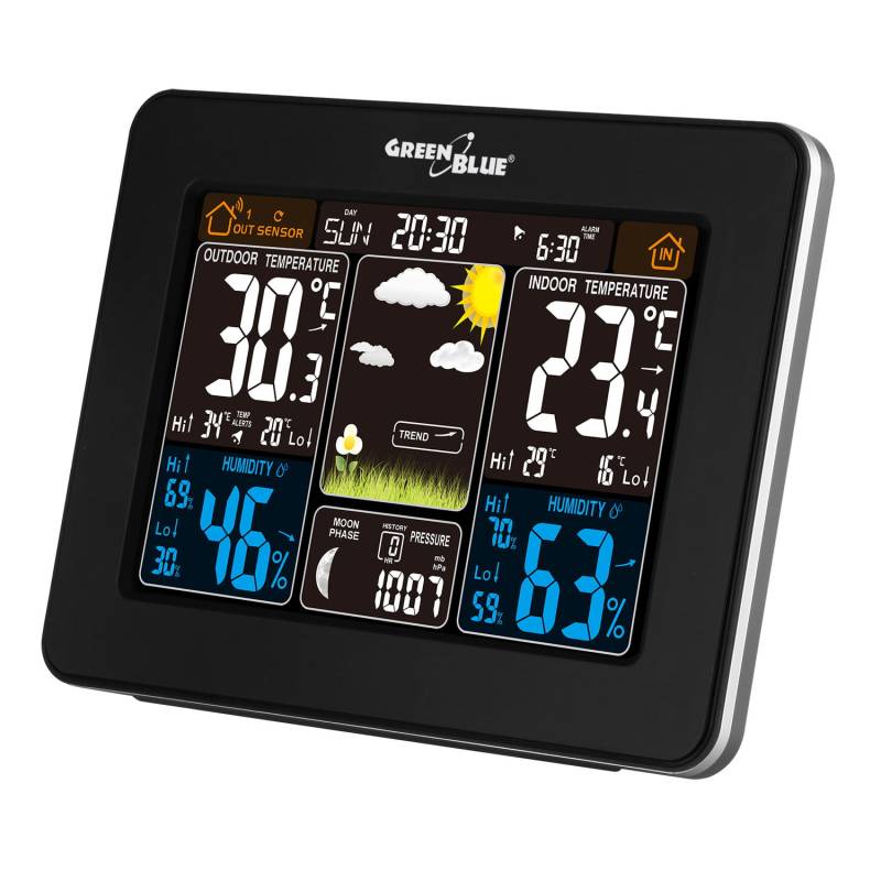 Stacja pogody bezprzewodowa GreenBlue, kolorowa, z systemem DCF, fazy księzyca, GB523