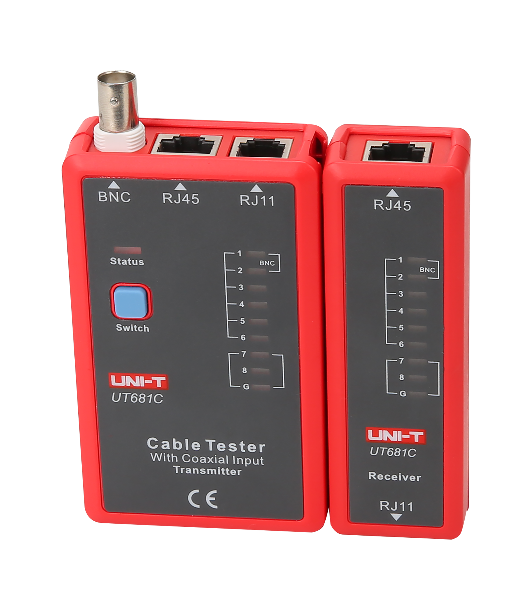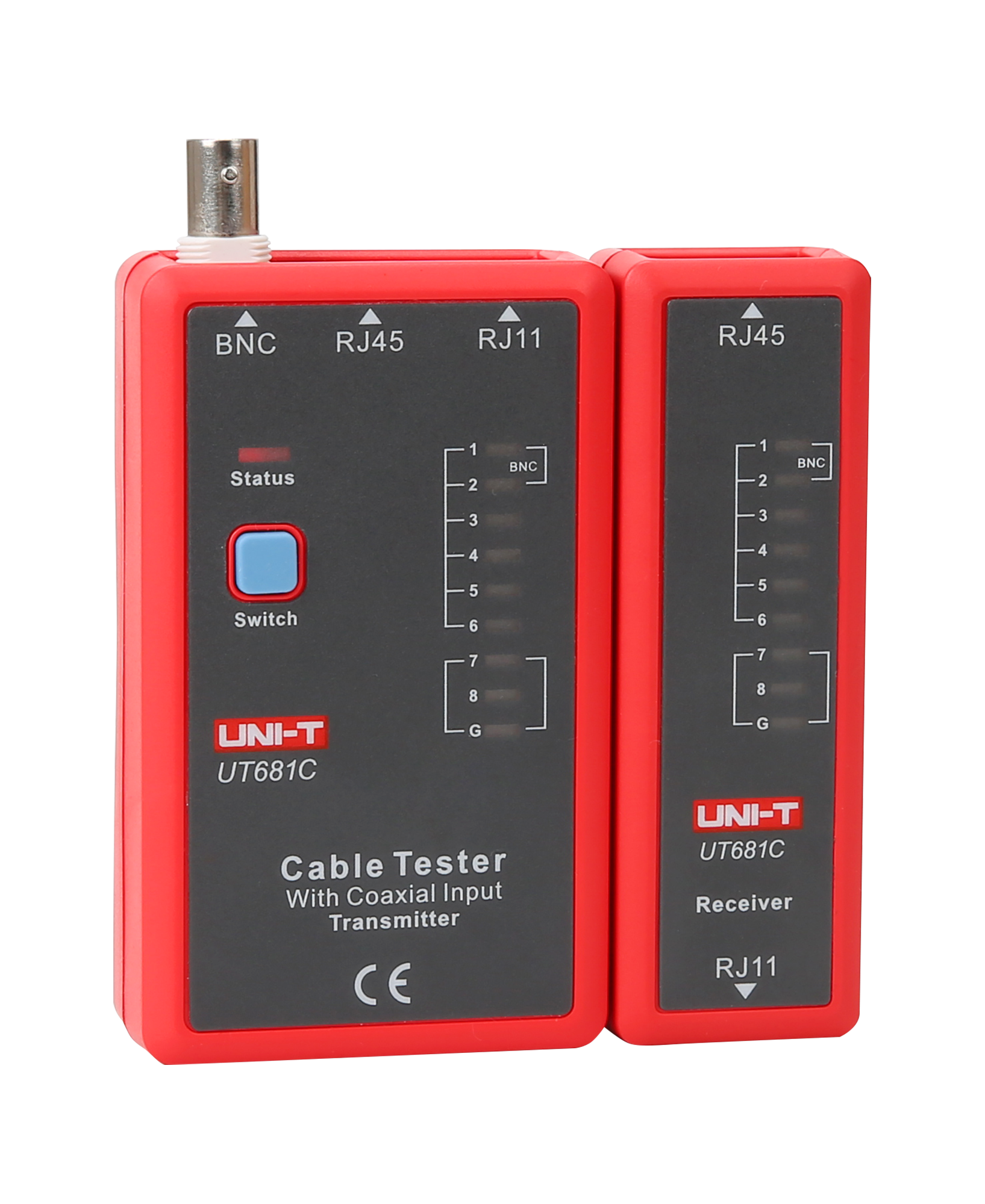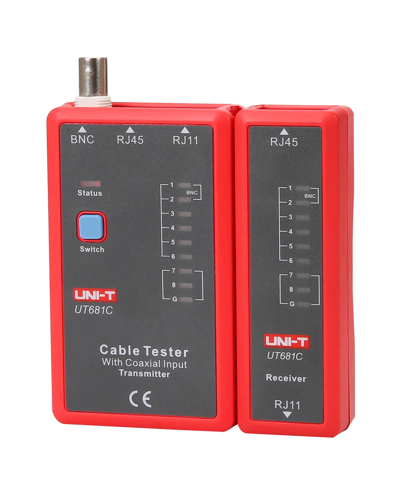 Uni-T UT681C jest wyposażony w nadajnik i odbiornik, które są kompaktowe i lekkie, co zapewnia wygodę użytkowania i łatwość w przenoszeniu. Nadajnik ma wymiary 102 x 62 x 28 mm i waży 87 g, podczas gdy odbiornik ma wymiary 102 x 37 x 28 mm i waży 51 g. Do zestawu dołączona jest bateria oraz przejściówka BNC-RJ45, co zapewnia pełne przygotowanie do użycia zaraz po zakupie.
