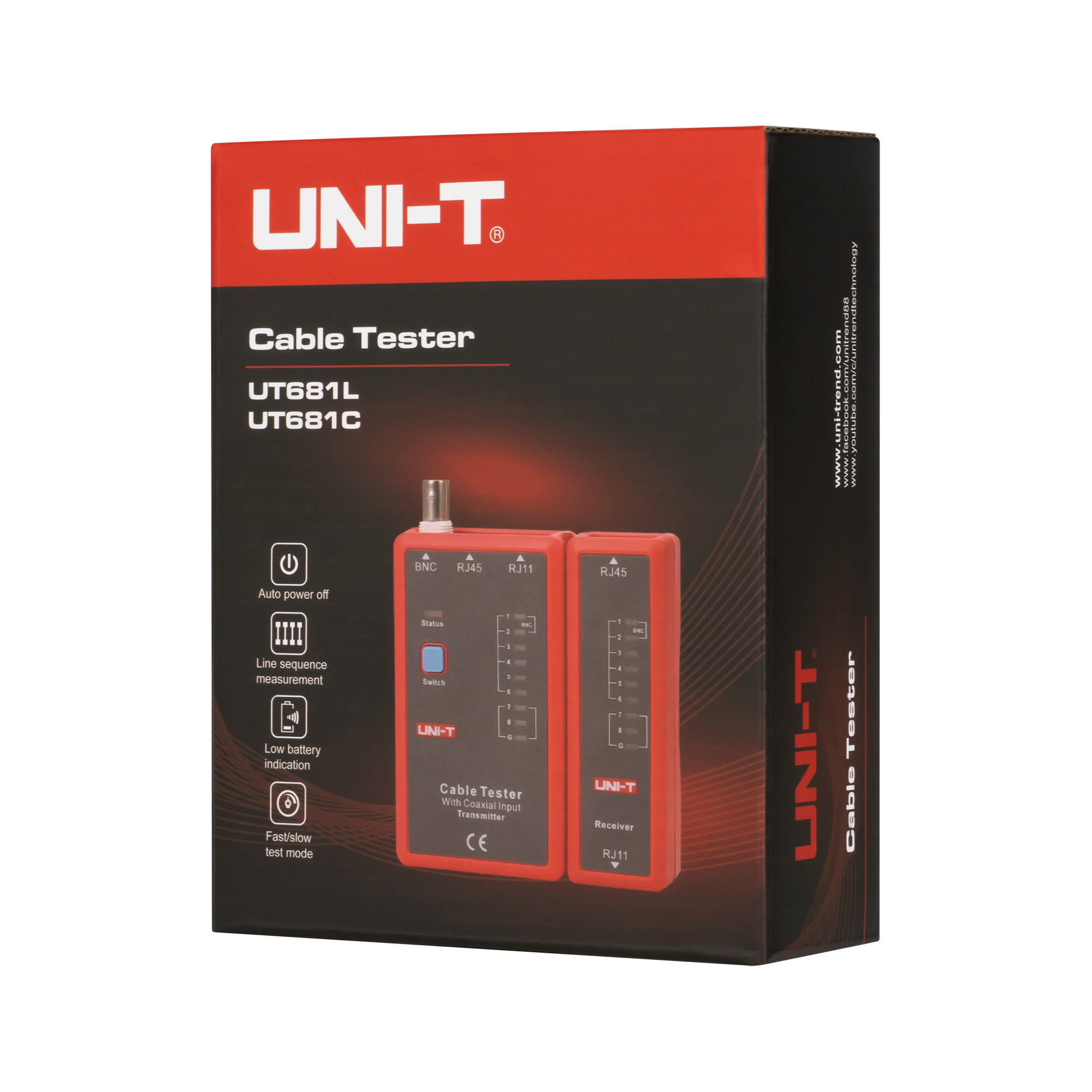 Uni-T UT681C obsługuje różne typy złączy, w tym RJ45, RJ11 i BNC, co sprawia, że jest uniwersalnym narzędziem do testowania różnorodnych kabli. Tester umożliwia pracę w trybie szybkiego lub wolnego pomiaru, co pozwala dostosować sposób testowania do konkretnych potrzeb. Funkcje testowania na obecność zwarcia oraz przerwy w obwodzie zapewniają szybkie i efektywne diagnozowanie problemów z kablami.